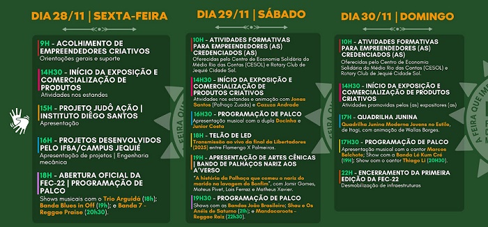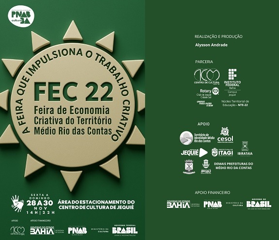 A Feira de Economia Criativa do Médio Rio das Contas (FEC 22) vem ampliando o número de expositores que buscam, sobretudo, dar visibilidade as suas marcas e produtos. A FEC 22 acontecerá no período de 28 a 30 de novembro, a partir das 14h, na área do estacionamento do Centro de Cultura de Jequié, com acesso livre e interpretação em libras.