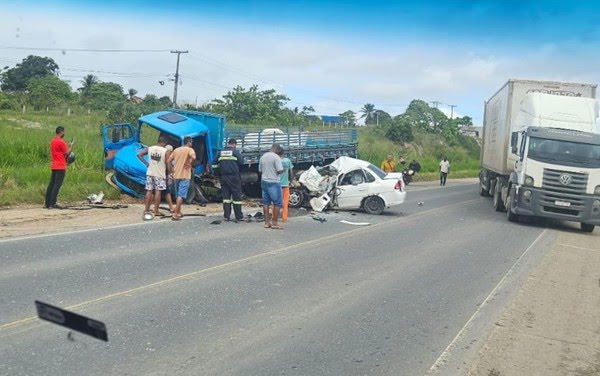 Três pessoas morreram e duas pessoas ficaram feridas após o carro em que estavam colidir na traseira de uma caçamba, na BA-001, trecho entre os municípios de Valença e Nazaré. O acidente aconteceu na manhã de sábado (17), por volta das 5h30.