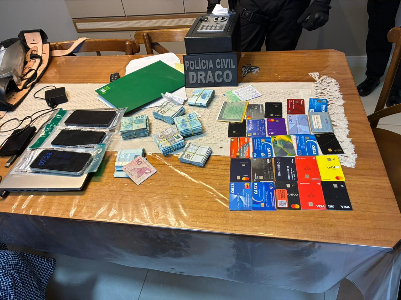 Durante as buscas, foram apreendidos celulares, documentos, cerca de R$ 70 mil em espécie e computadores, que serão periciados e poderão contribuir com o aprofundamento das investigações. As apurações seguem em andamento para identificar outros recursos possivelmente desviados e eventuais novos integrantes do grupo criminoso, com foco na completa responsabilização dos envolvidos.
