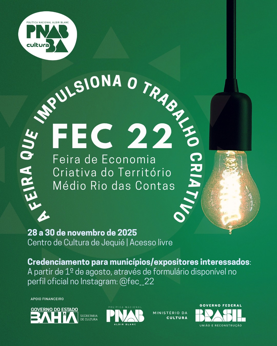 A FEC 22 disponibilizará uma infraestrutura adequada aos municípios e demais expositores, cujo evento será realizado de 28 a 30 de novembro de 2025 (sexta, sábado e domingo), a partir das 14h, na área do estacionamento do Centro de Cultura de Jequié, com entrada gratuita e acessibilidade cultural. Os municípios do território poderão acessar o perfil oficial da FEC 22, na plataforma do Instagram (@fec__22), e assim realizarem seus credenciamentos através de formulário on-line que estará disponível na Bio.